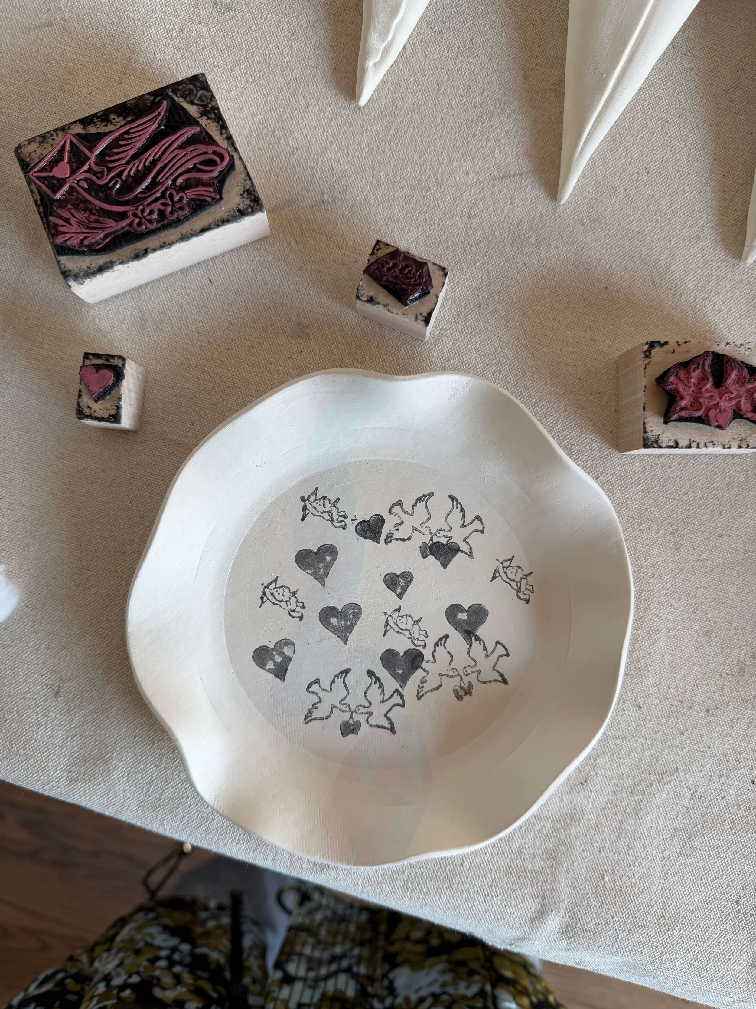 Using Potter’s Pads in Bright Red and Black from Minnesota Clay Company, I began stamping small motifs: hearts, doves, and cherubs. The imagery is intentionally romantic and nostalgic, almost like vintage stationery.