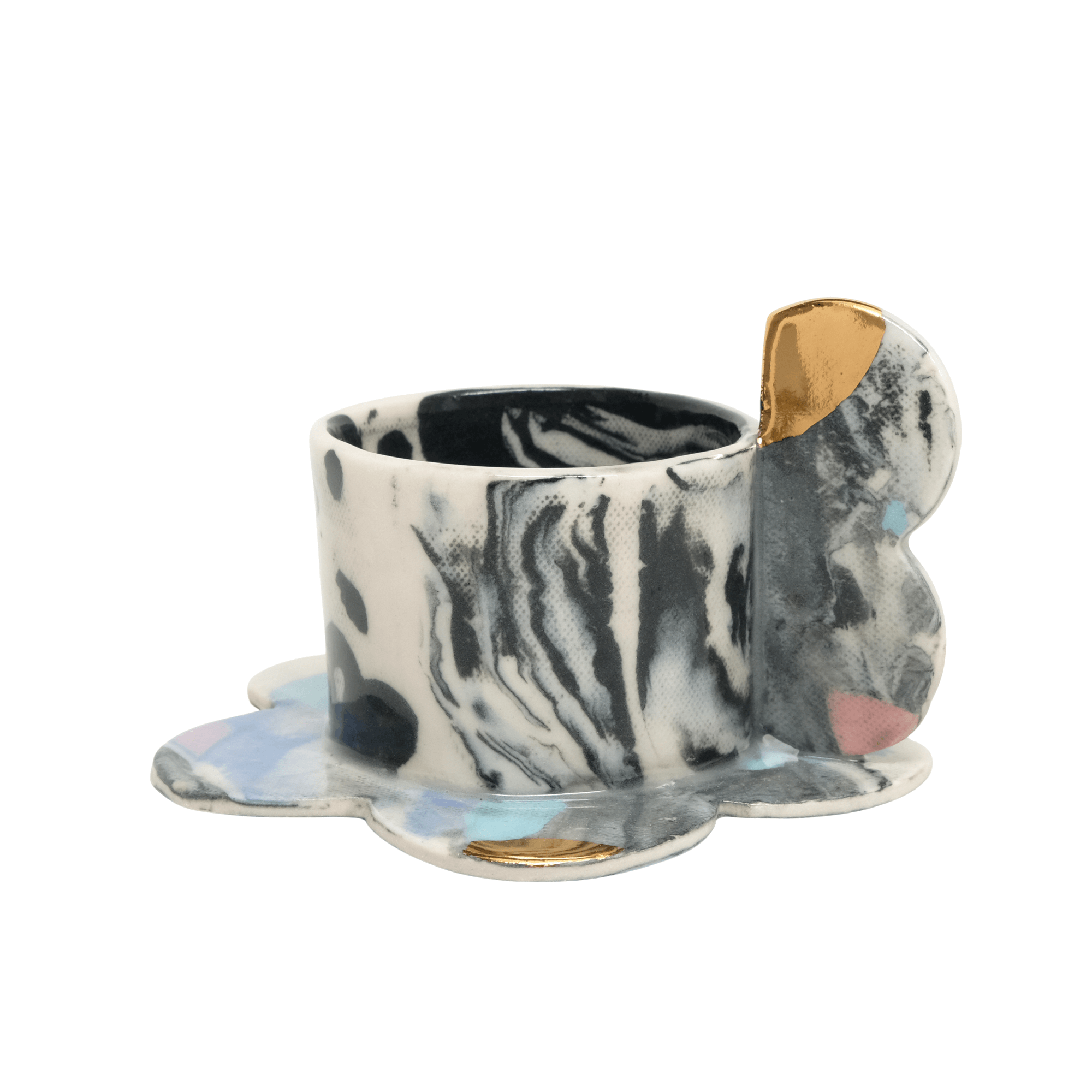 A dramatic combination of marbled porcelain in inky blacks and whites, this mug is finished with delicate speckles and painterly accents of pastel and gold luster. Its scalloped handle and base evoke petals, giving it a playful yet refined personality. A piece that feels both modern and timeless.